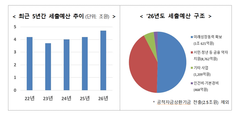금융위는 2026년도 금융위 소관 일반회계 세출예산이 4조6516억원으로, 작년(4조1838억원)보다 11.2% 늘었다고 4일 밝혔다.