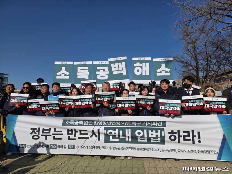 한국노동조합총연맹과 산하 공무원·공공생존권투쟁위원회는 4일 오전 서울 여의도 국회 앞에서 '공무원·교원의 소득공백 없는 법정 정년연장 이행 촉구 기자회견'을 열고 "65세 정년연장, 소득공백 해소하라"고 밝혔다. 이날 기자회견에는 더불어민주당 노동존중실천단 소속 박정현·백승아 의원도 참석해 힘을 보탰다.