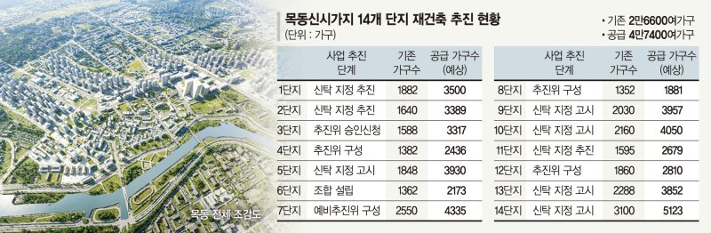 목동 신시가지 아파트들은 14개 단지 중 8개 단지가 신탁 방식을, 6개 단지가 조합설립방식으로 추진되고 있다. 선두를 달리고 있는 단지는 6단지로, 지난 5월 처음으로 조합설립 인가를 받았다. 4·8·12단지는 추진위원회 구성을 완료했고, 5·9·10·13·14단지 등 5개 단지가 신탁사 사업시행자 지정을 마쳤다.