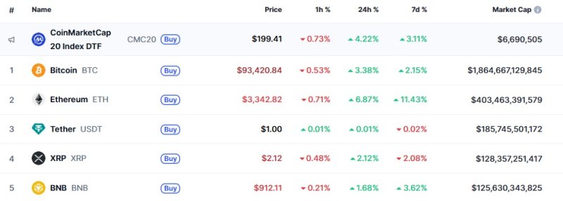 10일 오전 5시 20분 현재 글로벌 코인 시황 중계사이트 코인마켓캡에서 비트코인은 24시간 전보다 3.38% 상승한 9만3420달러를 기록하고 있다.