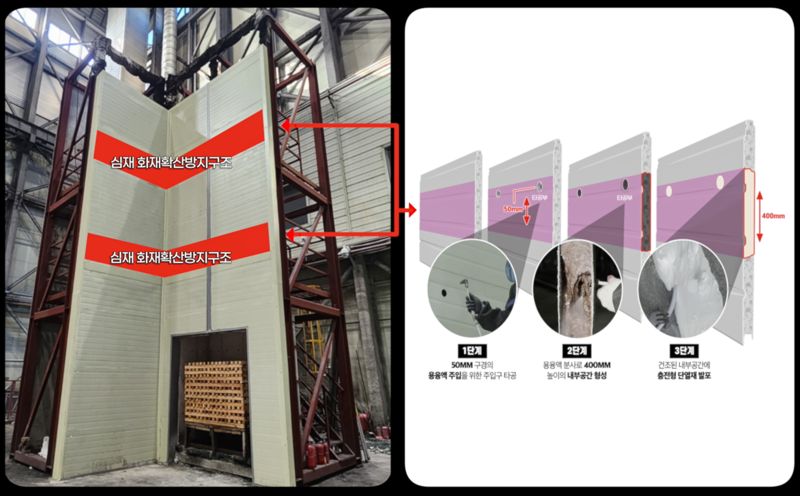 EPS 심재는 가연성이 높아 화재 시 연소가 빠르게 확대되는 문제가 있었지만, 강화된 화재안전 기준이 기존 시설에는 소급 적용되지 않아 취약점으로 지적돼 왔다. 건설연은 EPS 내부를 용융 처리한 뒤 준불연 이상 성능의 충전재를 주입하는 방식으로 난연 성능을 끌어올렸다.