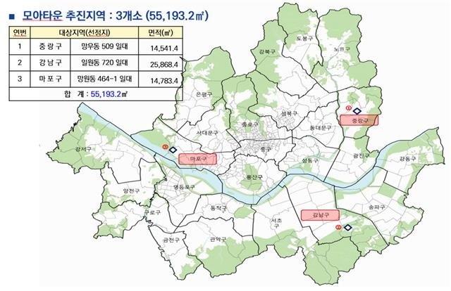 이에 따라 주민제안으로 모아타운 대상지에 신청된 중랑구 1곳, 강남구 1곳, 마포구 1곳이 포함된다. 이들 지역은 사도(私道)의 지분거래를 통한 투기행위를 차단하기 위해 도로를 대상으로 토지거래 허가구역을 지정했다.