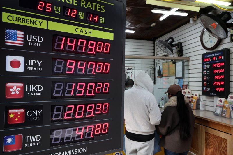 [서울=뉴시스] 배훈식 기자 = 원 달러 환율 고공행진이 계속된 14일 오전 서울 중구 명동 거리 환전소 시세가 달러당 1480원 턱 밑까지 올라 있다. 2025.12.14. dahora83@newsis.com ◆민주 창당 70주년, 큰절하는 정청래 대표