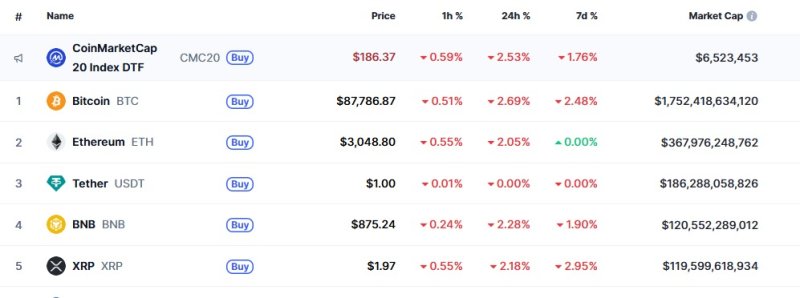 15일 오전 8시 30분 현재 글로벌 코인 시황 중계사이트 코인마켓캡에서 비트코인은 24시간 전보다 2.69% 하락한 8만7786달러를 기록하고 있다.
