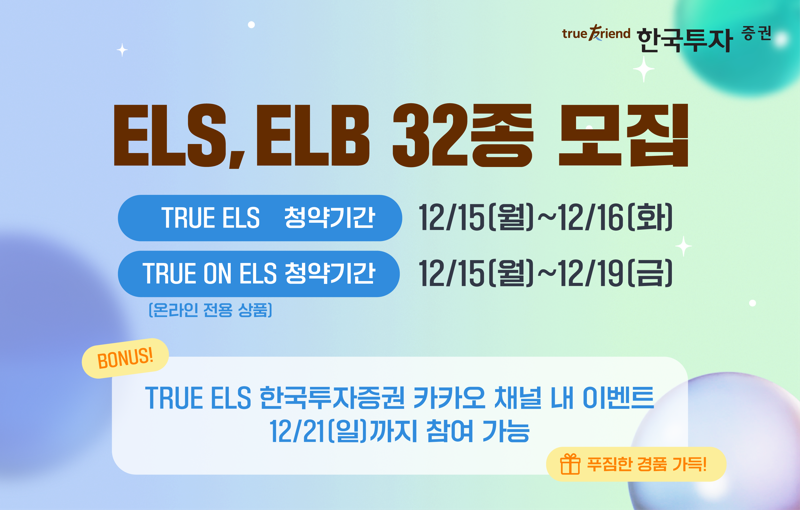 [파이낸셜뉴스] 한국투자증권은 주가연계파생결합사채(ELB) 및 주가연계증권(ELS) 상품 32종을 출시한다고 15일 밝혔다.