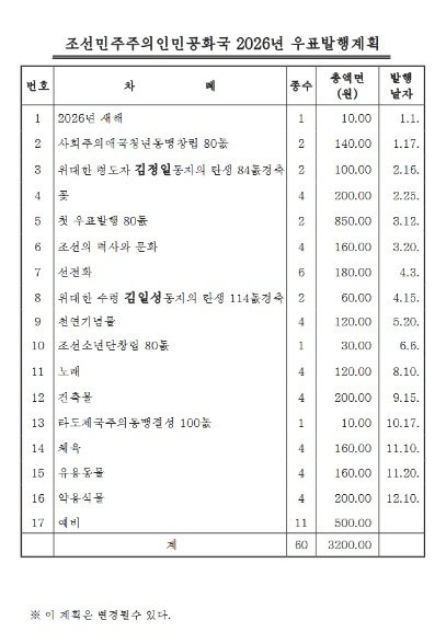 우리의 우정사업본부에 해당하는 북한의 조선우표사는 15일 '조선민주주의인민공화국 2026년 우표 발행 계획'을 문화어(북한어), 영어, 러시아어, 중국어 등 4개국어로 공개했다.