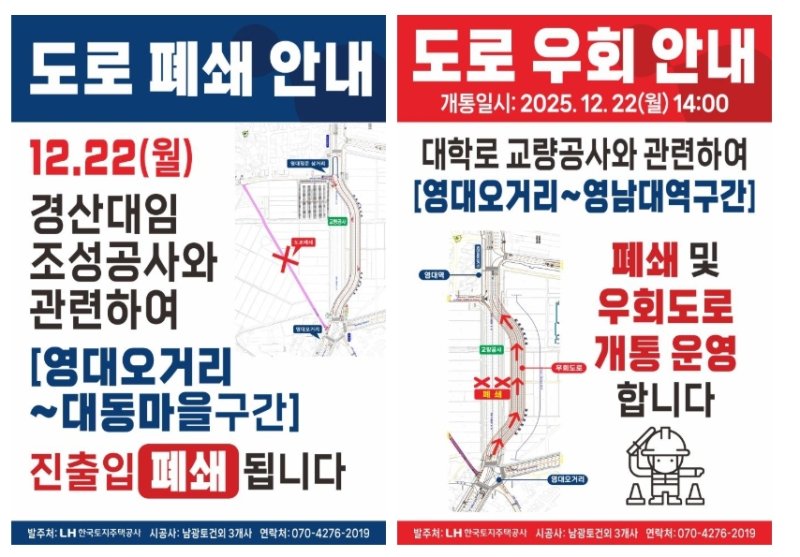 시에 따르면 영대오거리~대동마을 도로는 대임 공공주택지구 조성 공사로 도로가 영구 폐쇄되고, 영대오거리~영남대역 구간은 1년간 우회도로가 운영된다.