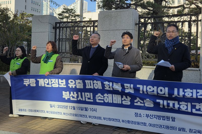 피해자들의 소송대리인 법무법인 진심과 8개의 시민단체는 15일 오전 부산지방법원 앞에서 '쿠팡 개인정보 유출 피해 회복 및 기업의 사회적 책임 촉구 소송 기자회견'을 열었다.