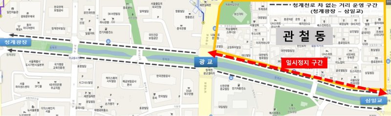 차 없는 거리 운영 재개로 1일부터 청계천 북측 청계2가 교차로~광교 교차로는 토요일 오후 2시~일요일 오후 10시, 공휴일 오전 10시~오후 10시 차량 통행이 금지되므로 이동 시 사전 확인이 필요하다.