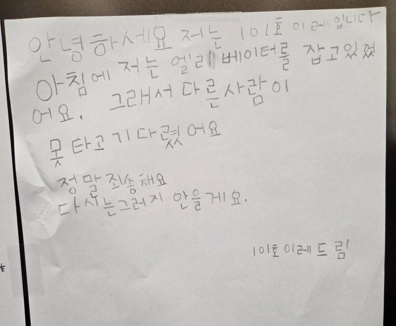 아이의 글에는 "아침에 엘리베이터를 잡고 있었어요, 그래서 다른 사람이 못 타고 기다렸어요"라며 "정말 죄송해요"라는 문구가 적혀 있다.