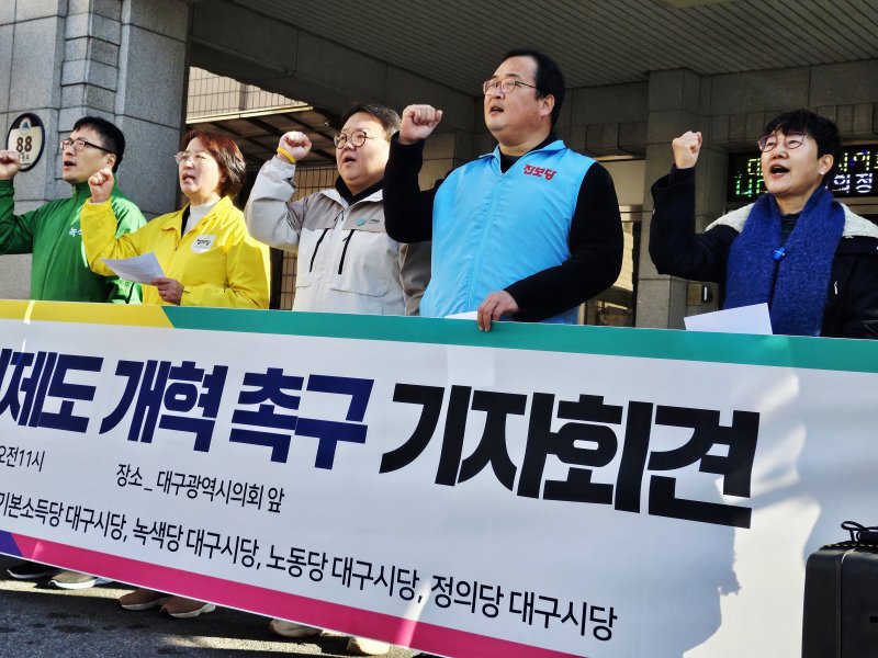 조국혁신당과 진보당, 기본소득당, 녹색당, 노동당, 정의당 대구시당은 15일 대구시의회 앞에서 회견을 열어 지방의회 선거제도 개혁을 촉구했다. 야 6당은 "지방의회의 비례성을 강화하고 다양성 보장을 위해 선거제를 개혁해야 한다"고 주장했다.
