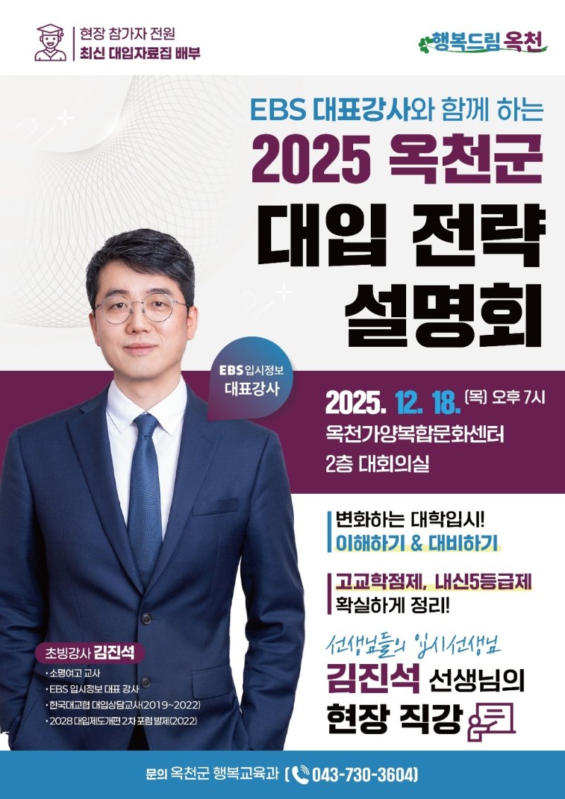 (옥천=뉴스1) 장인수 기자 = 충북 옥천군은 오는 18일 EBS 대표 강사와 함께하는 대학 입시 전략 설명회를 연다고 15일 밝혔다.