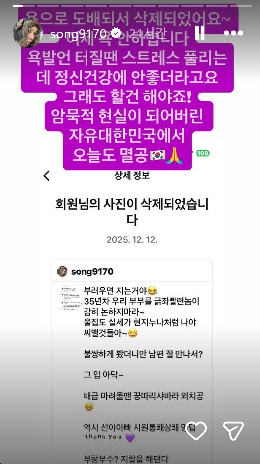 댓글에는 "부러우면 지는거야. 35년차 우리 부부를 좌빨XX이 감히 논하지 마라" "불쌍하게 봤더니만 남편 잘 만나서? 그 입 아닥" "배급 마려울 땐 꿍따리샤바라 외치고" "부창부수 지X을 해댄다" 등 특정 표현을 두고 거친 반응을 보이며 비속어가 포함된 문장이 이어졌다.