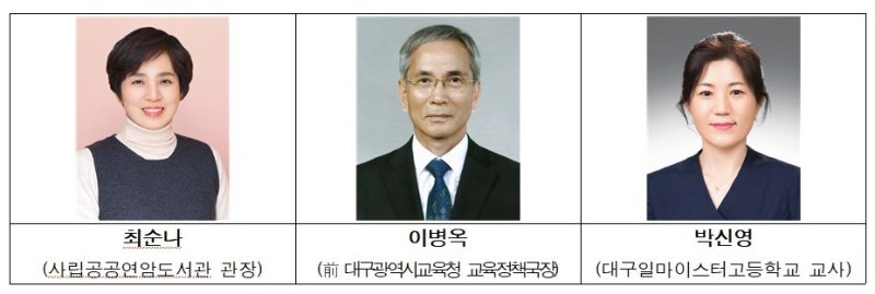 올해는 초등교육 부문에서 최순나 사립공공연암도서관장, 중등교육 부문에서 이병옥 전 시교육청 교육정책국장, 박신영 대구일마이스터고 교사가 수상했다.