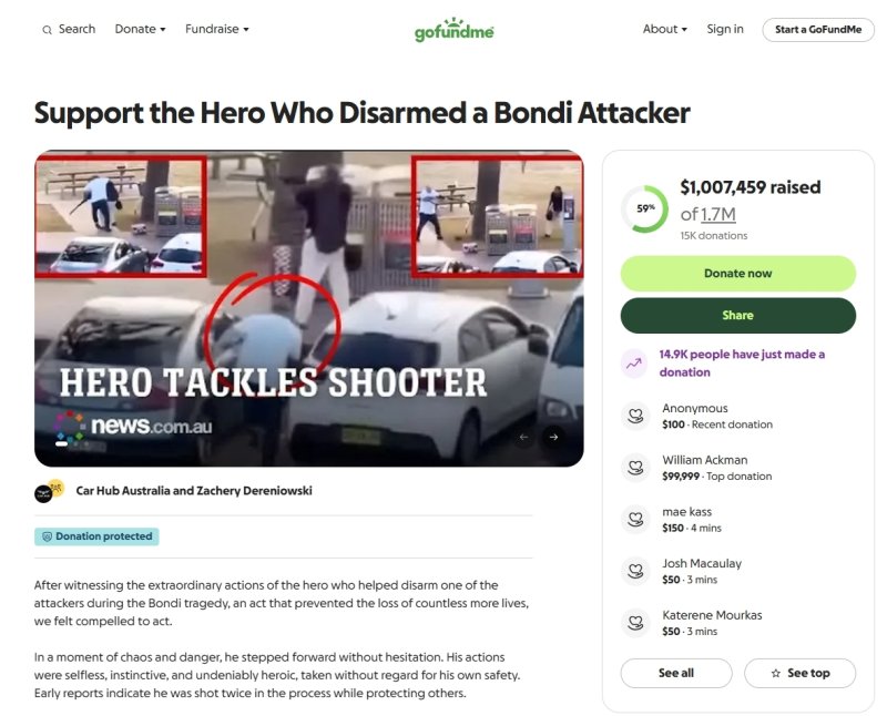 (런던=뉴스1) 이지예 객원기자 = 호주 본다이 해변의 총격범을 제압한 시민 영웅이 총상으로 수술을 받고 회복 중이다. 시리아 출신의 40대 무슬림 이민자인 그를 돕기 위한 모금액이 벌써 10억원 가까이 모였다.