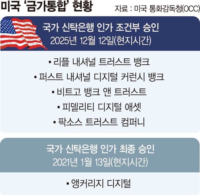 이번에 조건부 승인을 받은 리플 내셔널 트러스트 뱅크는 가상자산 기업 '리플'이 설립한 법인이며, 퍼스트 내셔널 디지털 커런시 뱅크 역시 달러 스테이블코인 발행사 '서클'이 신규 설립한 조직이다. 이들 기업은 이후 최종 승인을 받더라도 현금 예금을 받거나 대출 취급을 할 순 없지만 고객 자산 보관·관리 업무는 가능하다. 조너선 굴드 통화감독청장은 이번 승인을 두고 "연방 은행 시스템에 새로운 참여자가 진입하는 것은 소비자와 은행 산업, 그리고 경제 전반에 긍정적"이라고 밝혔다.