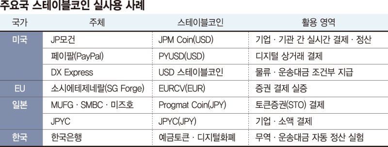 대표적인 사례는 JP모건의 'JPM코인'이다. JP모건은 2019년 JPM코인을 개발한 뒤 2020년부터 기업·기관 고객 간 실시간 자금 정산 서비스를 제공해왔다. 기존 국제송금에서 수시간에서 수일이 걸리던 결제 절차를 대폭 단축했으며, 다국적 기업과 금융기관이 참여하는 기관 간 정산 수단으로 활용되고 있다.