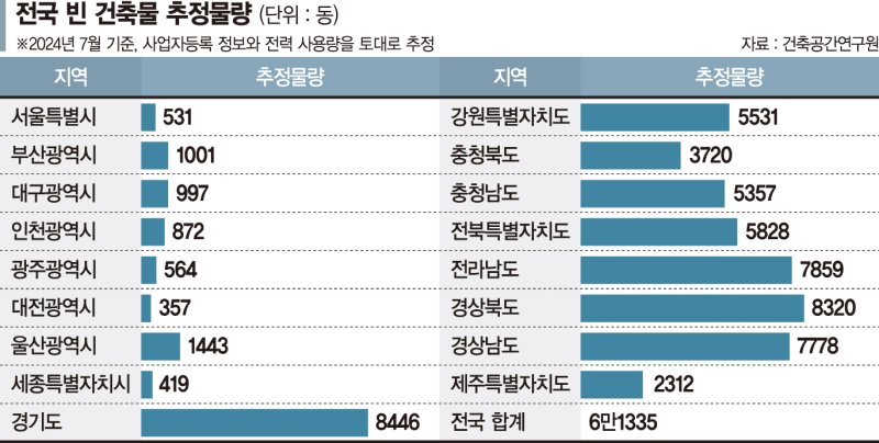 지역별로 보면 빈 건축물은 수도권과 비수도권 전반에 걸쳐 분포해 있다. 수도권에서는 경기도가 8446동으로 전국 광역지자체 가운데 가장 많았고, 인천은 872동, 서울은 531동으로 집계됐다. 수도권 외곽과 노후 산업시설이 혼재된 지역을 중심으로 상가·공장 공실이 장기화되고 있다는 분석이다.