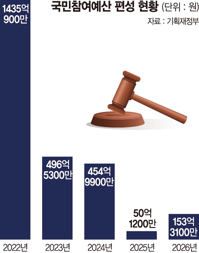 하지만 윤석열 정부의 긴축재정 기조에 따라 국민참여예산은 2023년 496억5300만원으로 절반 이하로 줄어든 뒤 지속적인 감소세를 보였다. 지난해에는 50억1200만원까지 축소됐다.
