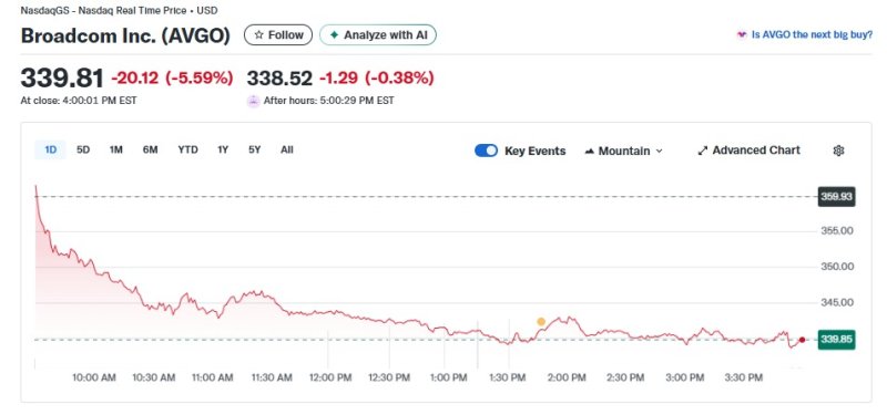 15일(현지 시각) 뉴욕증시에서 브로드컴은 5.59% 급락한 339.81달러를 기록했다. 이에 따라 시총도 1조6050억달러로 줄었다.