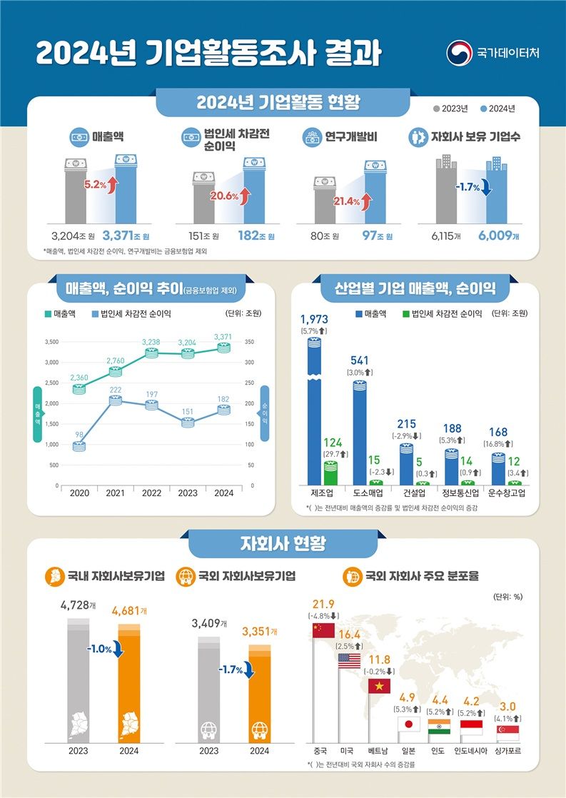 16일 국가데이터처가 발표한 '2024년 기업활동조사 결과'에 따르면 지난해 기업의 총매출액은 3371조1000억원으로 전년 대비 5.2% 증가했다. 업종별로는 전문과학기술업(23.3%), 운수·창고업(16.8%), 숙박 및 음식점업(13.3%) 등에서 증가했다.
