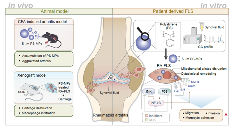 동물실험에서도 미세플라스틱에 장기간 노출된 관절염 모델은 관절 염증이 뚜렷하게 악화됐다. 특히 미세플라스틱으로 자극한 환자 유래 활막섬유아세포를 이식한 제노그래프트 모델에서는 연골 침식과 대식세포 침윤이 유의하게 증가하는 결과가 확인됐다.