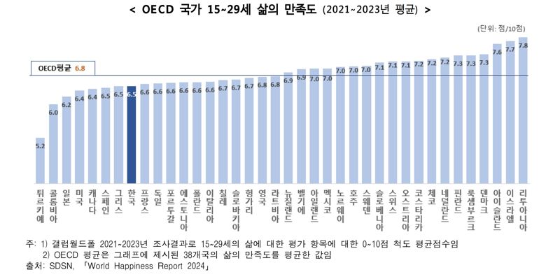 [파이낸셜뉴스] 한국 청년(15~29세)의 삶의 만족도가 경제협력개발기구(OECD) 국가 중 31위로, 평균보다 낮은 것으로 나타났다. 청년의 삶의 만족도가 가장 높은 국가는 리투아니아로 미국과 일본은 한국보다 순위가 낮은 것으로 조사됐다.