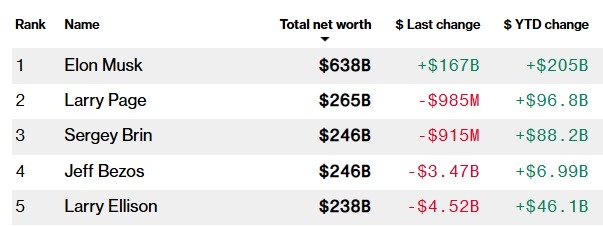 2위 구글의 공동 창업자 래리 페이지와는 3730억달러 차이가 난다.