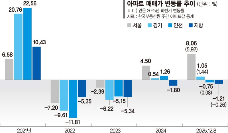 지난해와 비교해도 서울의 독주가 뚜렷했다. 2024년 서울 매매가는 4.50% 올랐는데 올해 상승률은 2배 가량 커진 것이다. 경기(지난해 상승률 0.54%)는 약보합에서 벗어나지 못했고 인천은 상승(1.26%)에서 하락으로 전환, 지방은 2년 연속 마이너스를 기록했다.