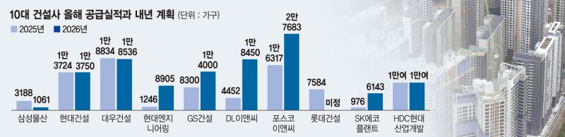실적 기준으로 올해 주택 공급 1위를 차지한 대우건설은 2025년 수준과 비슷한 1만8536가구를 분양할 계획이다. 현대건설도 올해 공급 실적과 비슷한 물량을 내년에 선보일 방침이다.