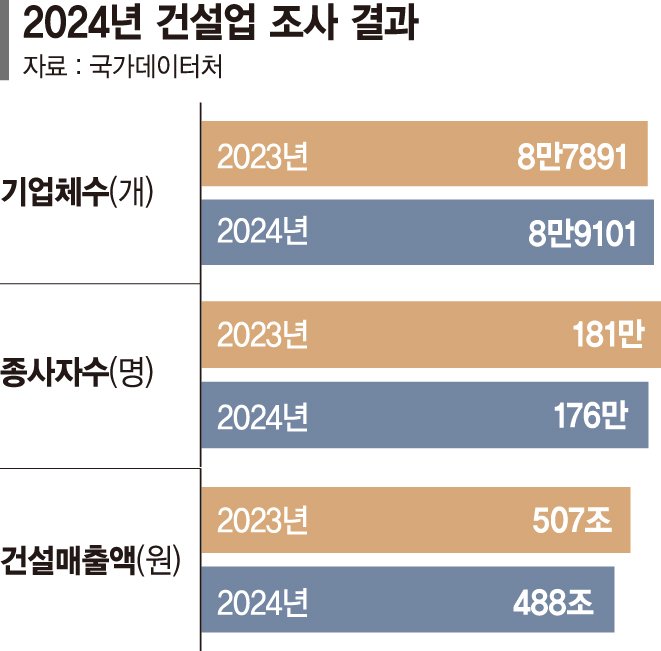 지난해 건설업 기업체 수는 8만9101개로 전년 대비 1.4%(1210개) 증가했지만 종사자 수(-2.8%), 매출액(-3.8%), 건설비용(-2.6%), 부가가치(-5.2%)는 모두 감소했다.