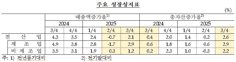 17일 한국은행이 발표한 ‘2025년 3·4분기 기업경영분석 결과’에 따르면 지난 3·4분기 외감기업 매출액 증가율은 2.1%로 집계됐다. 전분기(-0.7%) 대비 2.8%p 높아졌다. 업종별로 봐도 제조업(-1.7%→ 2.9%), 비제조업(0.3%→ 1.2%) 모두 상승했다.