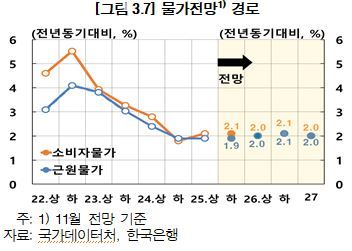 다만 김 부장은 “환율이 현재와 같은 1470원 내외 수준을 지속할 경우 물가 전가효과 확대로 소비자물가 상승률이 2% 초중반까지 높아질 우려가 있다”며 “겨울철 한파·폭설, 가축전염병 발행 상황에 따라 농축수산물 가격이 뛸 여지도 있는 만큼 물가가 전망 경로대로 움직이는지 점검할 계획”이라고 덧붙였다.