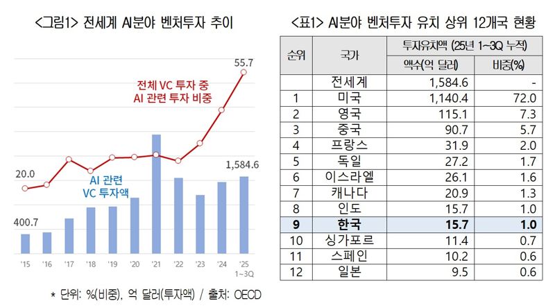 올해 1·4분기~3·4분기까지 전 세계에서 AI 분야에 투자된 벤처투자액은 총 1584억 달러로 10년 전인 2015년 400억 달러에 비해 약 4배 증가했다. 전체 벤처투자액 중 AI 분야에 투자된 비중은 2015년 20%에서 2025년 55.7%까지 급증했다.