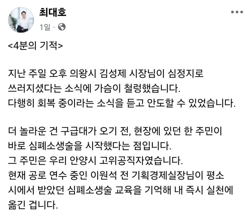 17일 안양시 등에 따르면 최대호 안양시장은 지난 16일 자신의 페이스북에 '4분의 기적'이라는 제목의 글을 올려 "구급대가 오기 전 김성제 시장에게 심폐소생술을 한 주민이 현재 공로연수 중인 이원석 전 안양시 기획경제실장이었다"고 밝혔다.