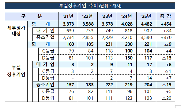 부실징후 중소기업(금융권 신용공여 500억원 미만)의 경우 204곳으로 지난해보다 15곳 감소했다. 다만 중소기업은 매분기 실시하는 수시평가에서 부실징후기업이 증가했다. 수시평가와 정기평가를 합산하면 올해 부실징후기업은 총 437곳으로 지난해보다 46곳 늘었다. 이 가운데 경영 정상화 가능성이 낮은 D등급은 35곳이 증가했다.