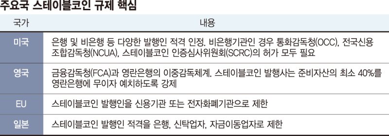 이 외에 유럽연합(EU)의 가상자산시장규제(MiCA)는 스테이블코인 발행인을 신용기관 또는 전자화폐기관으로 제한하고 있다. 일본은 자금결제법을 통해 스테이블코인 발행적격을 은행, 신탁업자, 자금이동업자로 뒀다.