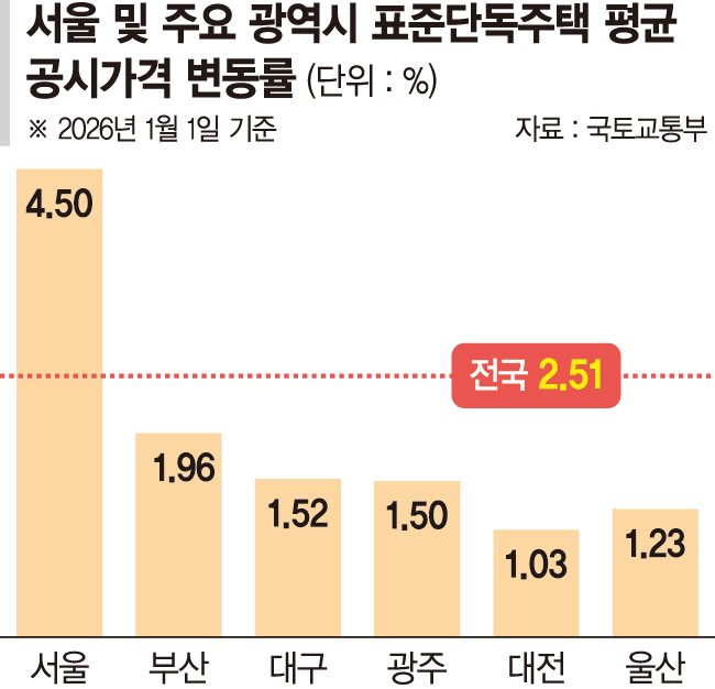 서울을 중심으로 부동산 가격이 단기간에 급등하면서 내년 전국 표준주택과 표준지 공시가격은 올해(표준주택 1.97%, 표준지 2.89%)보다 상승폭이 커졌다. 2025년과 동일하게 표준지는 시세의 65.5%, 표준주택은 53.6% 수준의 시세가 반영됐다.
