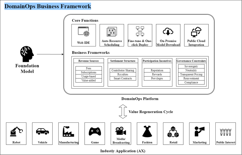 도메인옵스는 데이터 스페이스의 주권 보호 원칙과 상용 AI 플랫폼의 지속 가능한 수익화 모델을 결합해 제조∙공공 등 다양한 산업분야의 요구에 맞춰 거버넌스, 정산, 인센티브 구조를 유연하게 적용할 수 있는 모듈형 비즈니스 프레임워크를 제시한다.