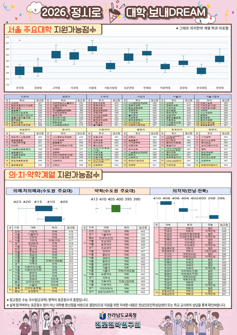 이번 배치표에는 수도권과 전라권 의·치·약학계열, 서울 주요 대학, 전남대의 지원 가능 점수가 함께 제시됐다.