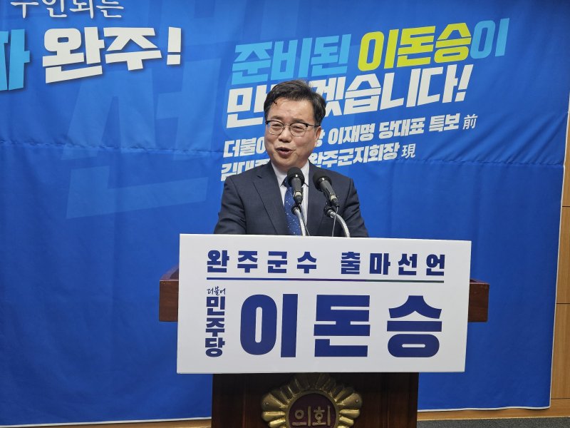 【파이낸셜뉴스 완주=강인 기자】 이돈승 김대중재단 완주군지회장은 18일 전북특별자치도의회에서 기자회견을 열고 "군민이 주인 되는 진짜 완주를 만들겠다"며 출마를 선언했다.