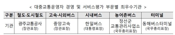 경영 및 서비스 평가는 철도, 버스 등 대중교통운영자가 제공하는 서비스를 국토교통부장관과 지방자치단체장이 평가해 대중교통을 체계적으로 지원·육성하기위해 실시하고 있다. 철도·도시철도(16개), 고속·시외버스(77개), 시내버스(388개), 농어촌버스(88개), 터미널(32개) 등 운수업체의 경영효율성, 서비스 품질, 안전관리 등을 종합적으로 평가한다.