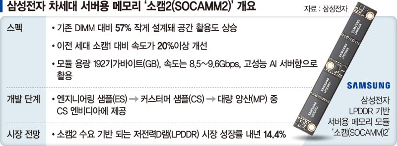 삼성전자는 18일 공식 홈페이지 테크 블로그를 통해 최신 저전력더블데이터레이트5X(LPDDR5X) 기반 서버 메모리 모듈인 소캠2를 개발해 고객사(엔비디아)에 샘플을 공급하고 있다고 밝혔다.