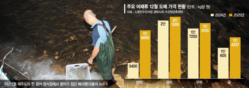 굴 가격 역시 가파른 오름세를 보였다. 지난해 ㎏당 1만605원이었던 굴 가격은 올해 1만4237원으로 1년 새 3632원(34.2%) 급등했다. 수산업계는 제철 어패류 수요가 정점에 달하는 연말연시까지 공급부족 현상이 이어질 것으로 전망했다.