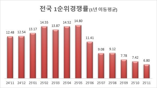 평균 경쟁률이 7대 1 밑으로 떨어진 것은 2023년 8월(6.59대 1) 이후 27개월 만이다.