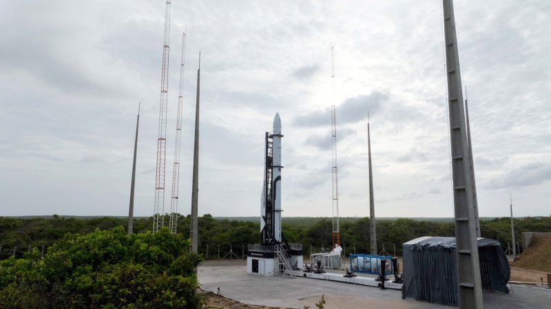 한국시간 20일 오전 4시 35분 브라질 알칸타라 우주센터서 이노스페이스의 로켓 '한빛-나노'가 기립한 모습. 이노스페이스는 국내 우주기업 최초로 첫 상업에 도전한다.(이노스페이스 제공)/뉴스1