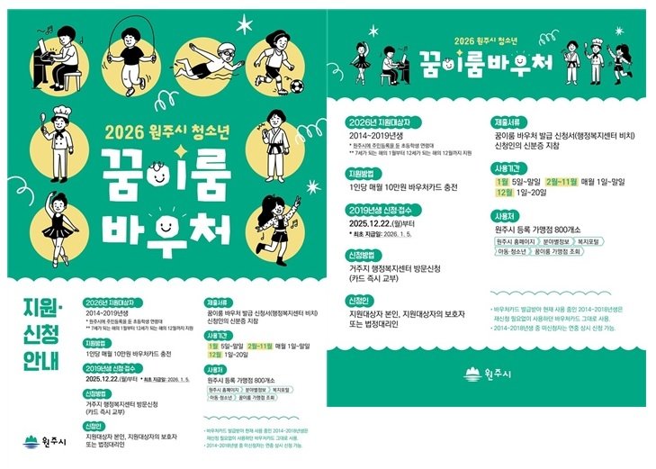 (원주=연합뉴스) 임보연 기자 = 원주시는 지역 아동의 건전한 성장을 지원하기 위한 '2026년 원주시 청소년 꿈이룸 바우처' 신규 이용자 모집을 시작한다.