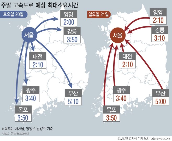 오후 2시 요금소 기준으로 승용차를 이용한 주요 도시 간 예상 소요시간은 하행선 ▲서울~부산 5시간 ▲서울~대구 4시간 ▲서울~광주 3시간30분 ▲서울~대전 2시간10분 ▲서울~강릉 2시간40분 ▲서울~울산 4시간40분 ▲서서울~목포 3시간10분이다.