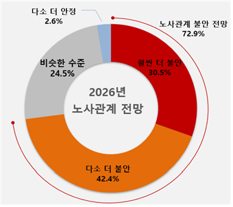 한국경영자총협회는 회원사 151곳을 대상으로 '2026년 노사관계 전망조사'를 실시한 결과 응답 기업 72.9%가 내년 노사관계가 올해보다 불안해질 것으로 내다봤다고 21일 밝혔다. 후년 노사관계를 부정적으로 전망한 비율은 2020년 이후 가장 높았다고 경총은 전했다.