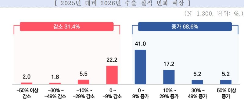 조사 결과 내년 수출이 올해 대비 증가할 것으로 예상한 중소기업은 응답자의 68.6%를 차지했다. 내년 수출이 올해보다 감소할 것으로 예상한 중소기업(31.4%)보다 두 배 이상 많았다.